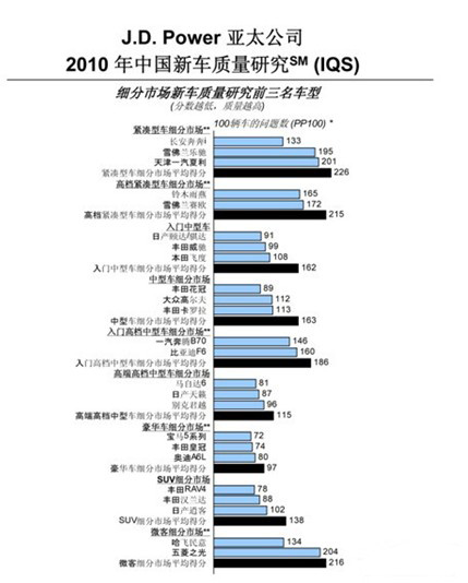 在評判標(biāo)準(zhǔn)方面,J.D. Power也比較獨(dú)特而且非常直觀,即綜合新車質(zhì)量的八大類別,以每百輛車所出現(xiàn)的問題數(shù)量來衡量,分?jǐn)?shù)越低表明發(fā)生故障的頻率越小,說明其質(zhì)量也越高。今年,J.D. Power的新車質(zhì)量調(diào)研報(bào)告顯示,一汽豐田的RAV4以78分的成績拉開了與其它同級別車型的距離,其表現(xiàn)遠(yuǎn)遠(yuǎn)優(yōu)異于SUV車細(xì)分市場138分的平均成績。COROLLA EX花冠則以89分在中級車細(xì)分市場連續(xù)三年穩(wěn)坐第一,該細(xì)分市場的平均分則高達(dá)163分。這一事實(shí)說明RAV4和COROLLA EX花冠在質(zhì)量問題方面的數(shù)量遠(yuǎn)低于同級別車型,是真正的高質(zhì)量車型;使趦H以2分之差在高端豪華車型中排第二名,威馳在入門中型車獲第二名,99的得分比162平均分高出63分之多,而卡羅拉質(zhì)量也緊接花冠之后排在中型車的第三名。