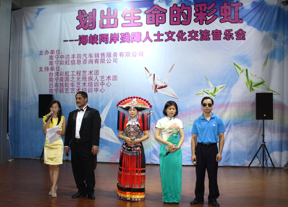 2011年6月4日晚上8點(diǎn),位于南寧市白沙大道24號(hào)的南寧中達(dá)豐田舉辦了一場具有特殊意義的音樂會(huì)——“海峽兩岸殘障人士文化交流音樂會(huì)”。音樂會(huì)特邀來自我國寶島臺(tái)灣的“彩虹工程藝術(shù)團(tuán)”和來自廣西本土的“南國之光殘疾人藝術(shù)團(tuán)”為在座的300余來賓帶來了一場美妙絕倫的歌舞盛宴。