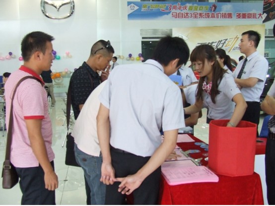 2011年7月31日,廣西鑫廣達(dá)長久汽車銷售服務(wù)有限公司三周年慶活動在店內(nèi)隆重舉辦,此次活動吸引來了眾多長安馬自達(dá)新老客戶參與,在新老顧客的支持和陪同下廣西鑫廣達(dá)長久汽車銷售服務(wù)有限公司三周年慶活動取得了圓滿結(jié)束。