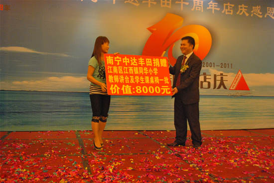 店慶當(dāng)天晚上,南寧中達(dá)豐田舉行了愛心捐助項目的善款交接儀式——對江南區(qū)江西鎮(zhèn)同華小學(xué)進(jìn)行愛心捐贈,在南寧中達(dá)豐田在長期以來堅持舉辦的愛心助學(xué)、扶貧幫困等愛心募捐活動中,逐漸形成了以愛心為核心理念的企業(yè)文化,這一企業(yè)文化影響著一代又一代中達(dá)豐田人。
