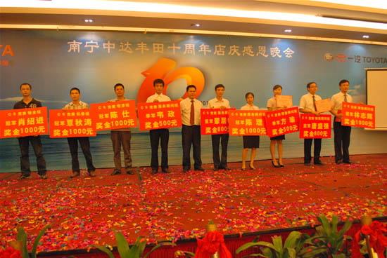 在9月6日舉行的十周年店慶晚會上,南寧中達(dá)豐田總經(jīng)理李偉峰先生向公司全體員工為公司發(fā)展所做出的貢獻(xiàn)表示感謝,同時為在公司連續(xù)服務(wù)滿十周年以上員工及其家屬頒發(fā)十周年忠誠員工獎及隆重謝禮。南寧中達(dá)豐田的十周年既是一個享譽各界的里程碑,也是邁向更加輝煌的起點。