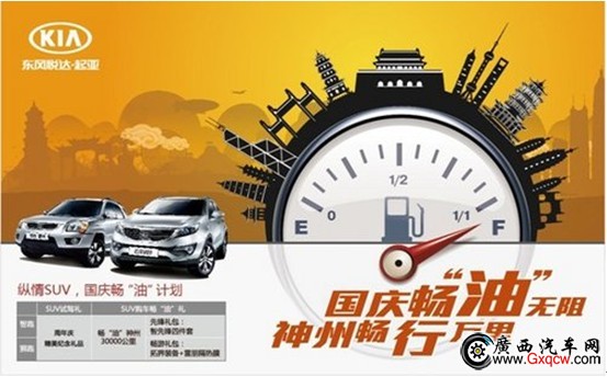 黃金假期,東風悅達起亞與您一同暢”油“萬里,活動期間,親臨東風悅達起亞4S店,坐享雙重驚喜好禮。試駕SUV即獲得精致好禮,購車更享受暢“油”神州30000里暢油禮。東風悅達起亞,為你的國慶之旅加油,試駕獅跑、智跑的周年紀念小禮品,購買智跑贈送智先鋒四件套,購買獅跑贈送拓界裝備+起亞專用膜,活動時間10月1日至10月30日,詳情請垂詢東風悅達起亞南寧榮力4S店,垂詢熱線:0771-3212688
