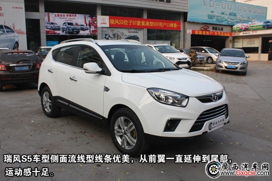 瑞風(fēng)S5車型側(cè)面流線型線條優(yōu)美,從前翼一直延伸到尾部,運動感十足。其車型特點是前后輪眉凸起、厚重,柳葉形車窗上沿與車頂平行、下沿與腰線平行,尾部有小三角窗點綴后,這個側(cè)面自然、飄逸。