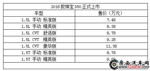 人民網(wǎng)北京11月16日電(涂欽瀚)近日,2016款北汽紳寶D50車型正式上市,新車售價區(qū)間為7.48萬-11.38萬元,與現(xiàn)款車型售價區(qū)間保持一致。新車共推出7款車型,搭載1.5L自然吸氣和1.5T渦輪增壓發(fā)動機。