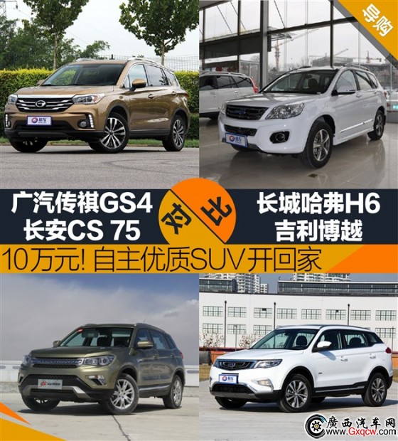 本次圖片車型為傳祺GS4(235T手動豪華版)、哈弗H6(升級版1.5T自動兩驅(qū)精英型)、吉利博越(1.8TD 自動四驅(qū)智尊型)和長安CS75(2.0L手動豪華型 國IV)。
