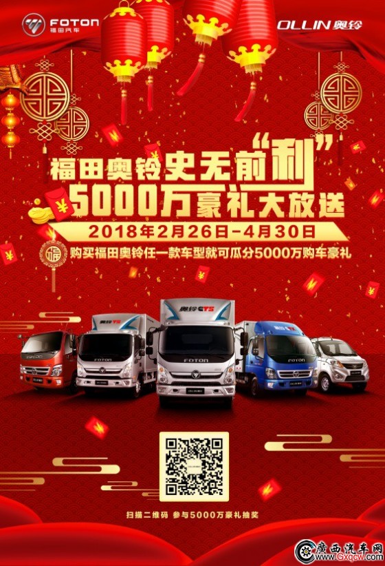 如果覺得到店禮不夠豪氣,還有購車禮。2月26日至4月30日,入門即是客,凡是到店購買福田奧鈴任意一款產(chǎn)品,均可獲得一次刮獎(jiǎng)機(jī)會(huì),全程給出購車禮,價(jià)值5000萬的四重豪禮大派送,中獎(jiǎng)率100%。