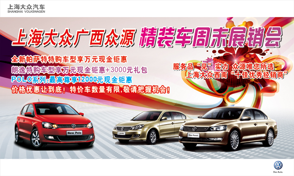 要想周末購現(xiàn)車,上海大眾現(xiàn)車觸手可及,而且能拿到*高讓利的好車,那就周末趕緊來上海大眾廣西眾源4S店吧!周末店內(nèi)全新帕薩特、朗逸現(xiàn)車充足,為慶祝廣西眾源上海大眾榮獲2011年度上海大眾西南“十佳優(yōu)秀經(jīng)銷商”的稱號,以及感謝一年來廣大上海大眾車主對廣西眾源的支持與厚愛,現(xiàn)推出“精裝車周末展銷會”,廣西眾源周末精裝現(xiàn)車周末展銷會,價格優(yōu)惠讓利底!特價車數(shù)量有限,敬請把握機會!