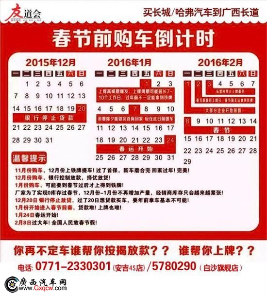 不想擠火車、不想“人在囧途”?想春節(jié)前購車?想拿現(xiàn)車?想享受大額優(yōu)惠?機會來了!1月1日至1月3日,為期3天“2016元旦車展暨第10屆南寧汽車博覽會”在A10展位。廣西長道攜長城廠家重磅打造鉅惠元旦車展,年終沖量活動。不用再猶豫了!