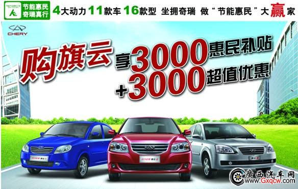7月,國(guó)家發(fā)改委、工信部和財(cái)政部聯(lián)合發(fā)布第八批汽車“節(jié)能產(chǎn)品惠民工程”推廣目錄(以下簡(jiǎn)稱目錄),奇瑞汽車包括4大動(dòng)力總成、11款車共計(jì)16款車型入圍,成為“節(jié)能惠民”大贏家。其中,奇瑞主銷車型旗云1、旗云2、旗云3憑借出色的節(jié)油性能、豐富的配置、優(yōu)惠的價(jià)格及過硬的品質(zhì)昂首入選,消費(fèi)者購車即可享受國(guó)家3000元惠民補(bǔ)貼。近期,旗云車型除享受3000元惠民補(bǔ)貼外,還可享受3000元超值優(yōu)惠促銷,另外還有“易購貸、“輕松貸”、“安心貸“等多種貸款購車方案可供選擇,消費(fèi)者成為此次節(jié)能惠民*大的受益者。