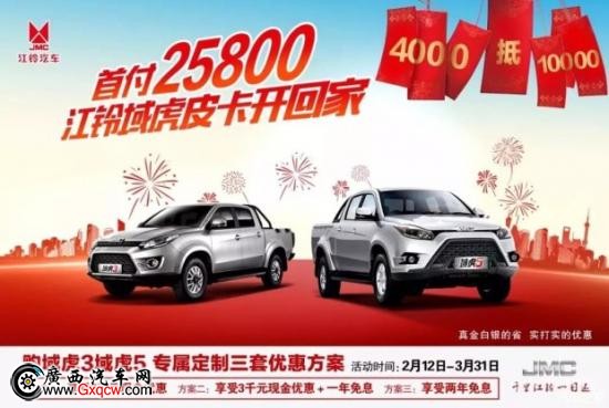 2月12日-3月31日,江鈴汽車針對(duì)旗下皮卡品牌——域虎家族,推出購(gòu)域虎3 域虎5可享受專屬定制優(yōu)惠方案的優(yōu)惠活動(dòng),購(gòu)車補(bǔ)貼高達(dá)6000元。