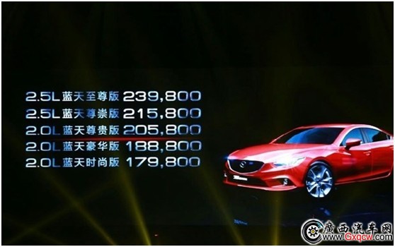 Mazda6 阿特茲全系共推出5款車型,7種顏色,分別搭載2.5升及2.0升創(chuàng)馳藍(lán)天發(fā)動機(jī),終端售價如下: