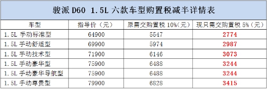 對(duì)于購(gòu)置稅減半優(yōu)惠,目前,駿派D60在售車型,有6款1.5L車型可以享受到。這為消費(fèi)者提供了更多的優(yōu)惠車型選擇。